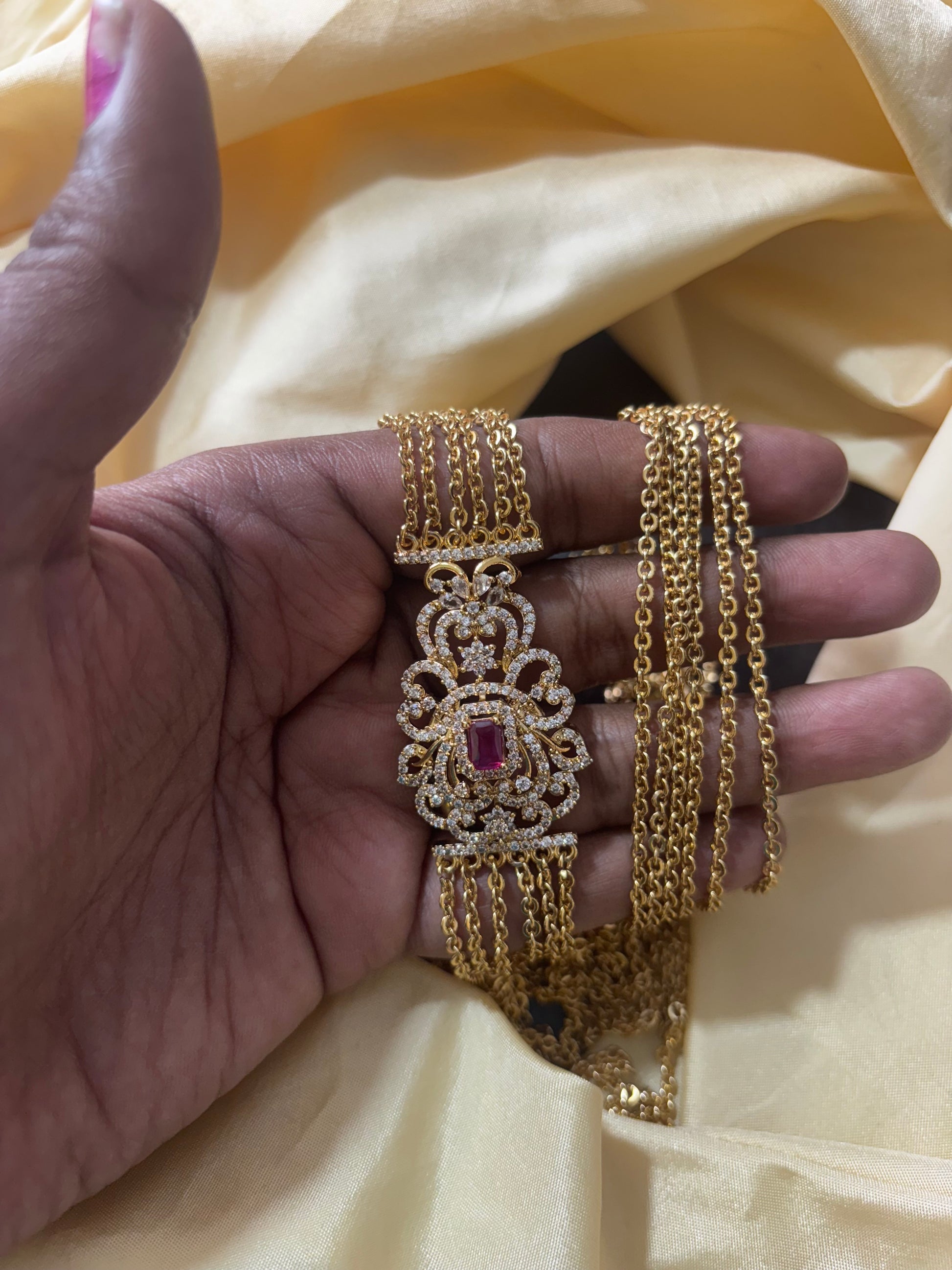 This 30-inch Mugappu chain features a sophisticated 5-layer matte finish that offers a subtle yet elegant appeal. Crafted without any goddess images, it suits those who prefer a minimalist and versatile design. Ideal for daily wear or special occasions, this chain combines traditional craftsmanship with a modern matte texture, ensuring durability and a refined look.