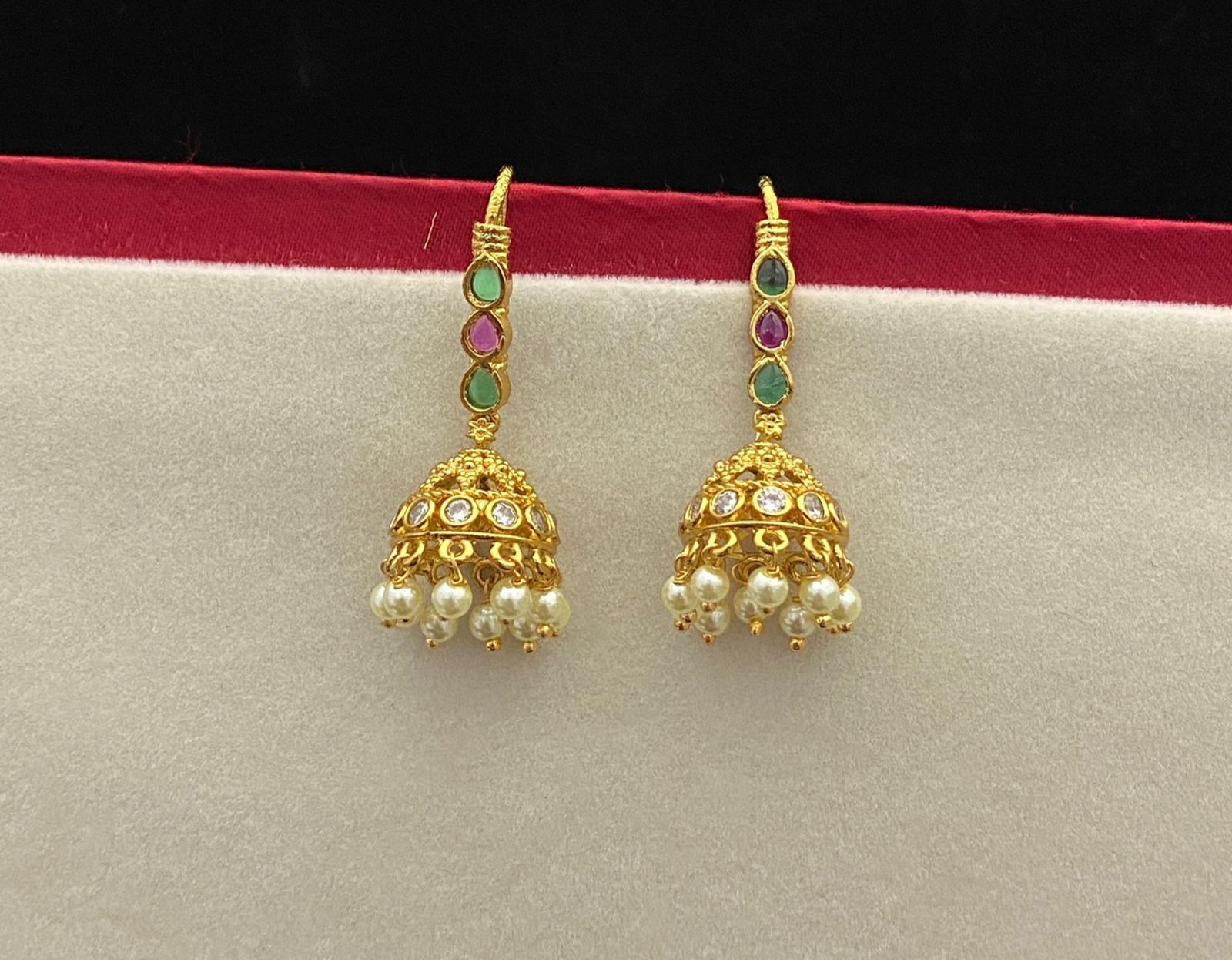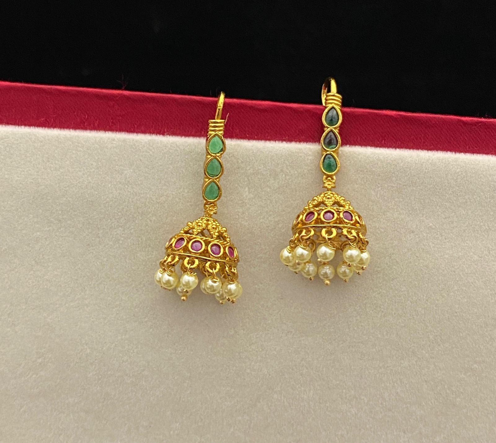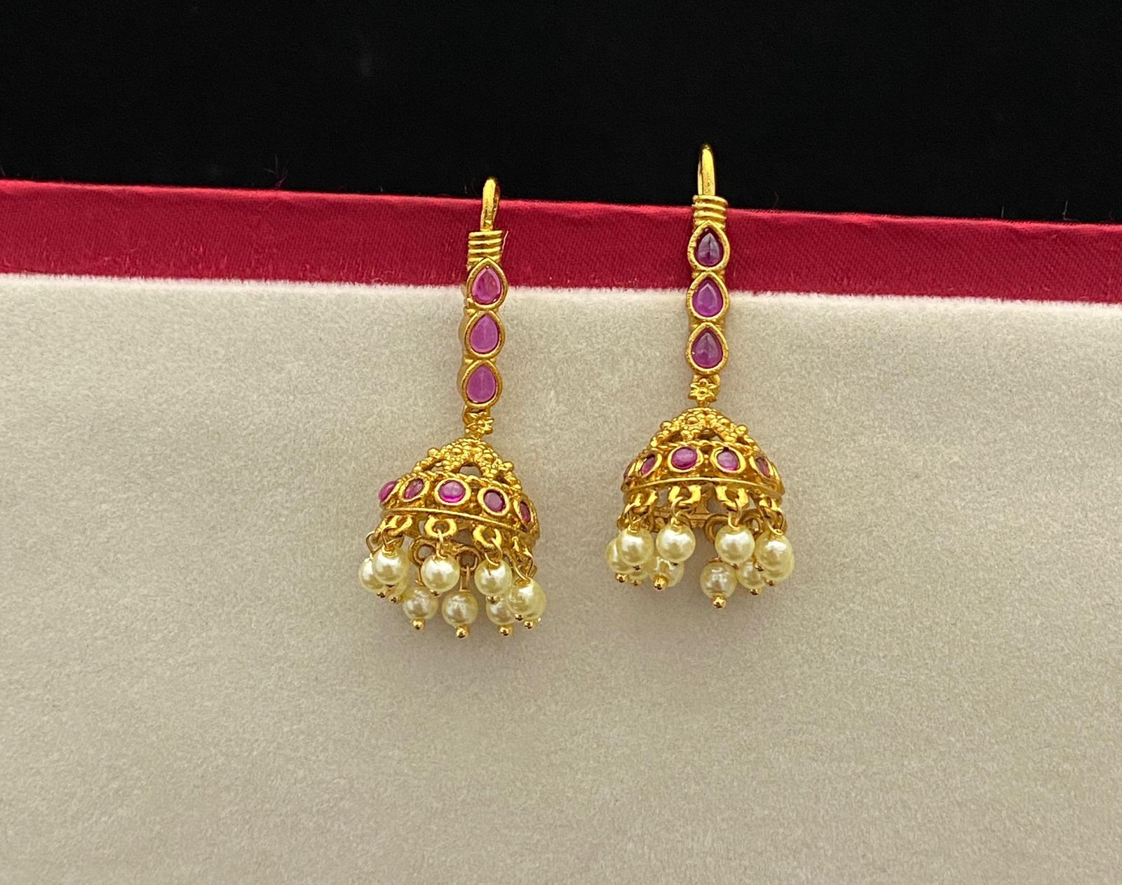 These charming little hanging jumkas feature vibrant Kempu and Ad stones, expertly crafted to add a touch of traditional elegance to any outfit. Their lightweight design ensures comfortable wear, making them perfect for both casual and festive occasions. Elevate your jewelry collection with these exquisite pieces that blend classic style with delicate detailing.
