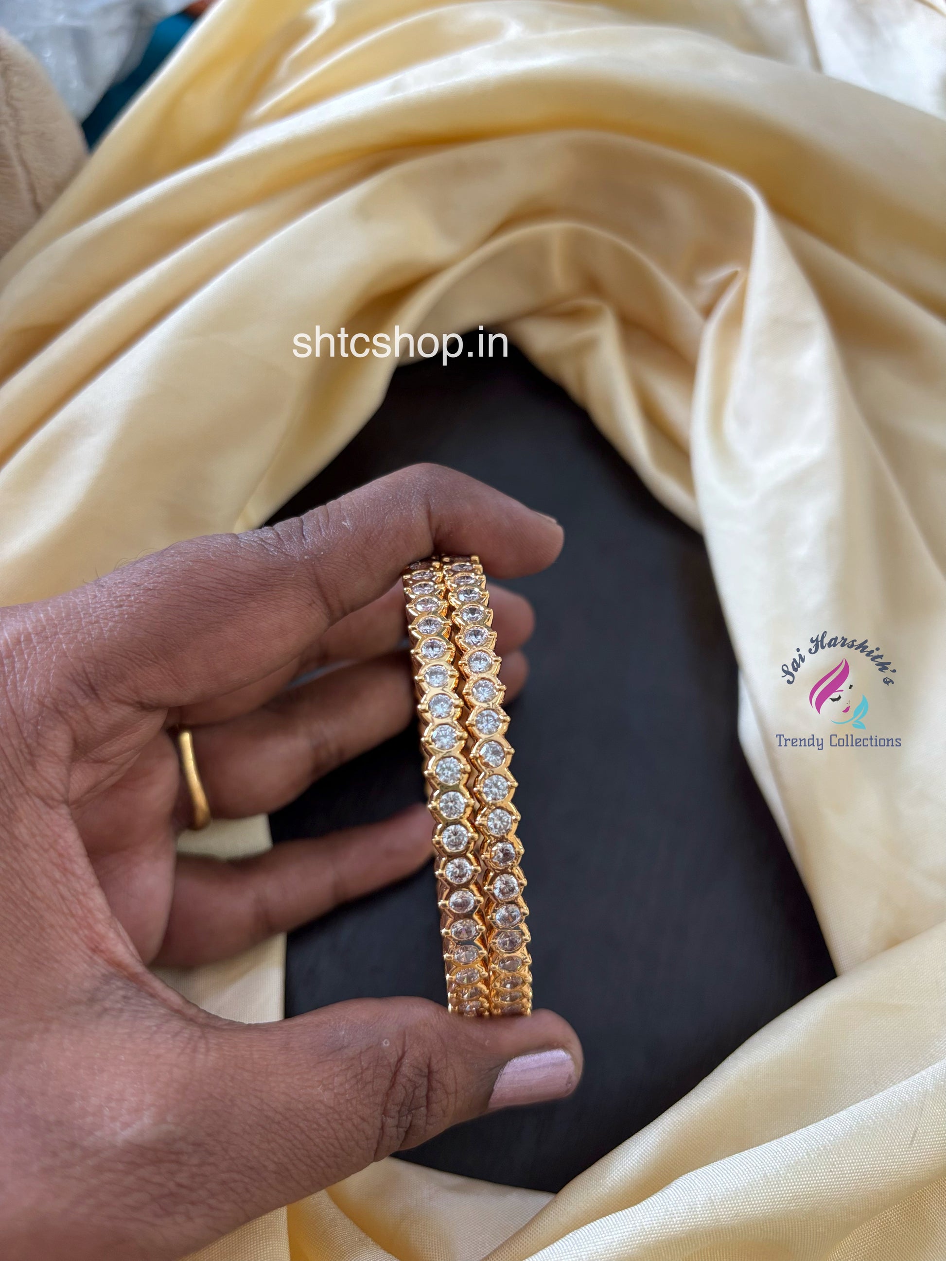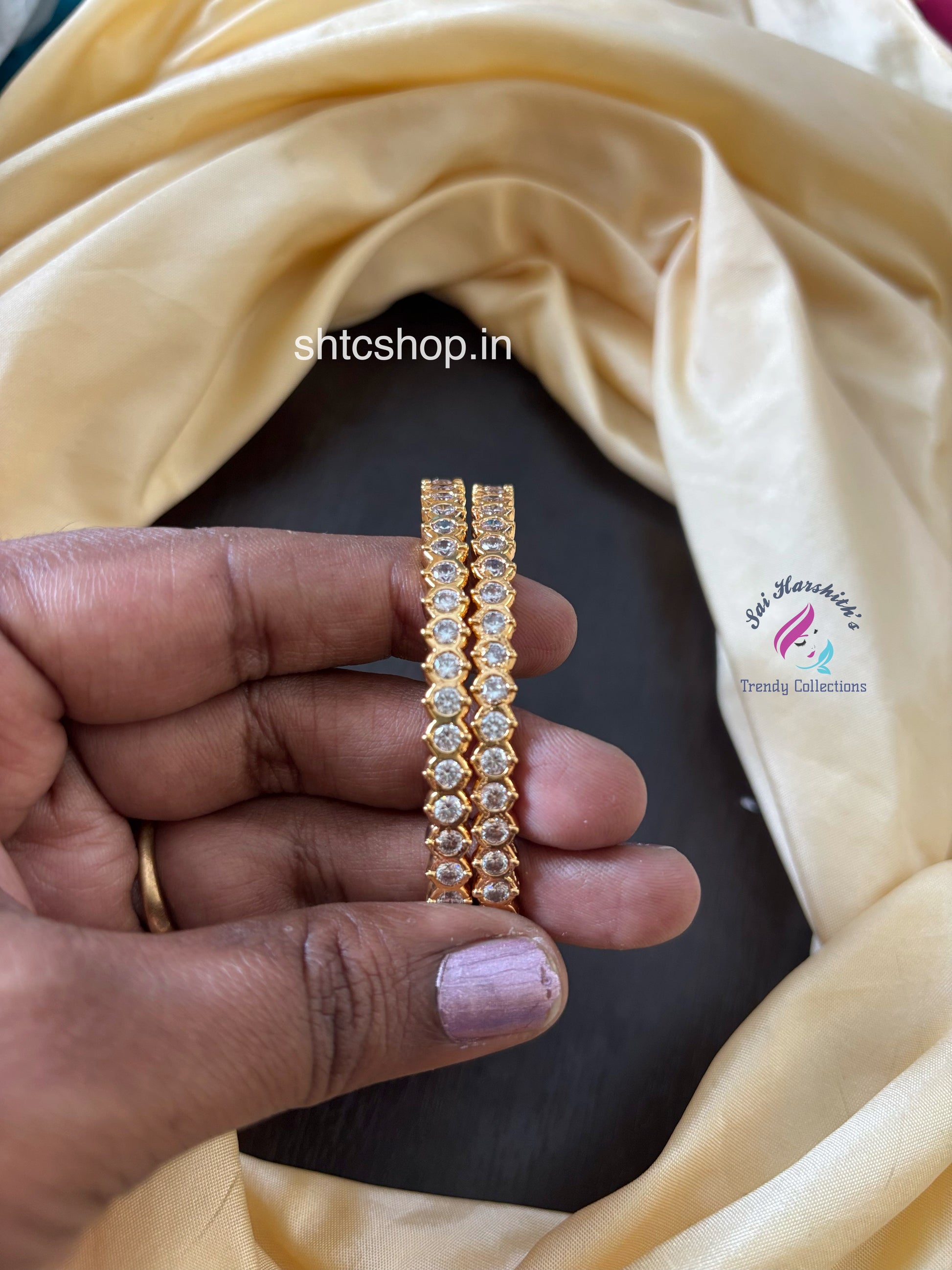 Elevate your traditional jewelry collection with this exquisite set of five metal bangles crafted from premium impon (alloy) and adorned with brilliant AD stones. Each bangle in this curated pair showcases meticulous detailing and lustrous finishes that complement both everyday wear and festive occasions. The AD stones catch light beautifully, adding sparkle and sophistication to your wrist. Perfect for layering or wearing individually, these versatile bangles blend timeless elegance with contemporary style. Ideal for those who appreciate quality craftsmanship and authentic traditional aesthetics.