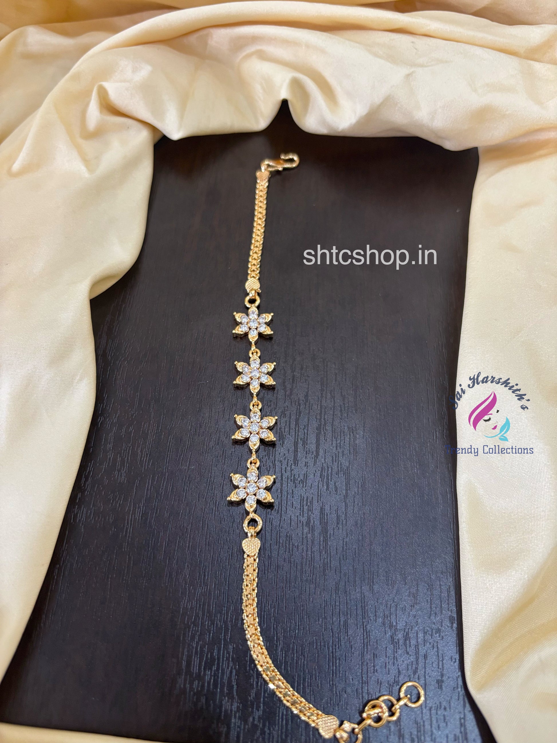 Elevate your accessory collection with this set of five meticulously crafted metal bracelets adorned with shimmering white AD stones. Each bracelet combines durability with intricate design, offering a sophisticated touch suitable for both casual and formal occasions. Perfect for layering or wearing individually to enhance your style with subtle elegance and timeless appeal.
