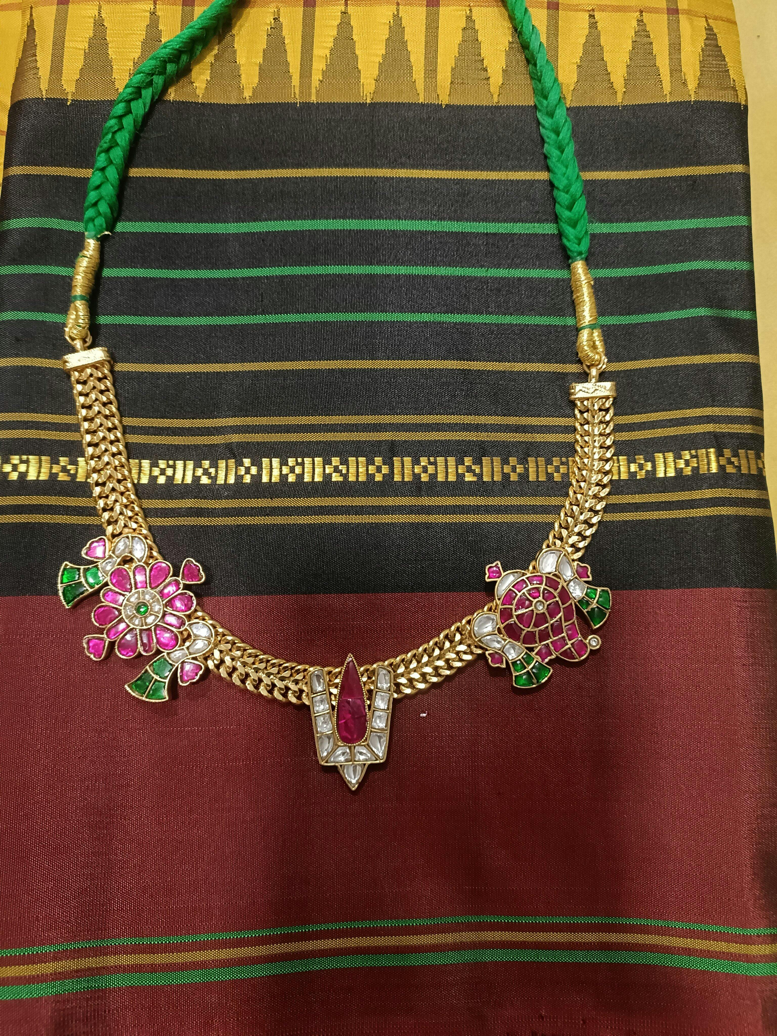Elevate your spiritual style with the Jadav Stone Statement Necklace. Made with authentic Jadav stones, this necklace features intricate Sangu and Chakra pendants, as well as a namam pendant, making it the perfect addition for devotees of Lord Venkatachalapathi or Perumal. Bring positive energy and enhance your spiritual connection with this exquisite necklace.